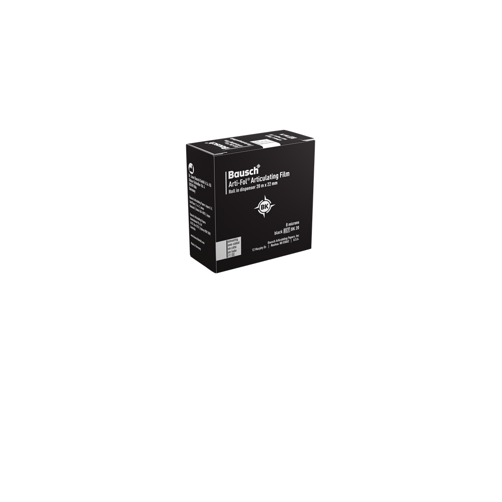 Bausch Arti-Fol® Occlusion films are especially suitable for representing static and dynamic occlusion in several colors. The first step is to inspect the static occlusion in red and the second step to inspect the dynamic occlusion in black. The color sequence can always be alternated. Several different colors can be used for a much more precise representation of dynamic occlusion. Bausch Arti-Fol® is available in four different colors. All films are available with double-sided color coating for the marking of antagonistic contacts.