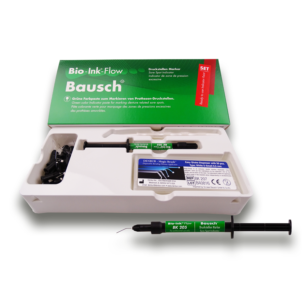 Bio-Ink®-Flow is intended for marking points, areas and lines on the oral mucosa, such as sore spots, AH-line and mucosal bands.  The relevant areas are colored with Bio-Ink®-Flow on the previously dried mucosa. When the dried denture is inserted, the color which has been applied to the sore spot is being transferred. Subsequently, the removable restoration can be adjusted.