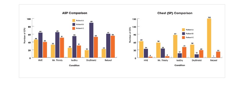 Overall, the data show a trend that the use of Mr. Thirsty® performed most similarly to HVE when considering both ASP and Chest SP results. It should be noted that all HVE devices used in this study reduced air sample bacterial counts when compared to the control air sample.