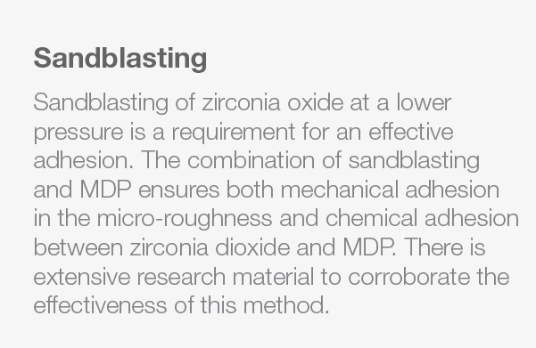 The restoration surface can be cleaned using alcohol after the sandblasting process. This step is optional. If the alcohol becomes contaminated, for example, by saliva residues, the effect will be negated, because the sandblasted surface would be contaminated as well. The choice of the fixation procedure is relatively simple provided MDP is used. This adhesive monomer was developed in 1981 by Kuraray Noritake Dental to improve the adhesive strength to hydroxyapatite, and has proved its strength ever since. MDP is not present in the glass ionomer cements (GIC’s), which, because of their ease of use, are also sometimes used for the cementation of zirconia restorations.