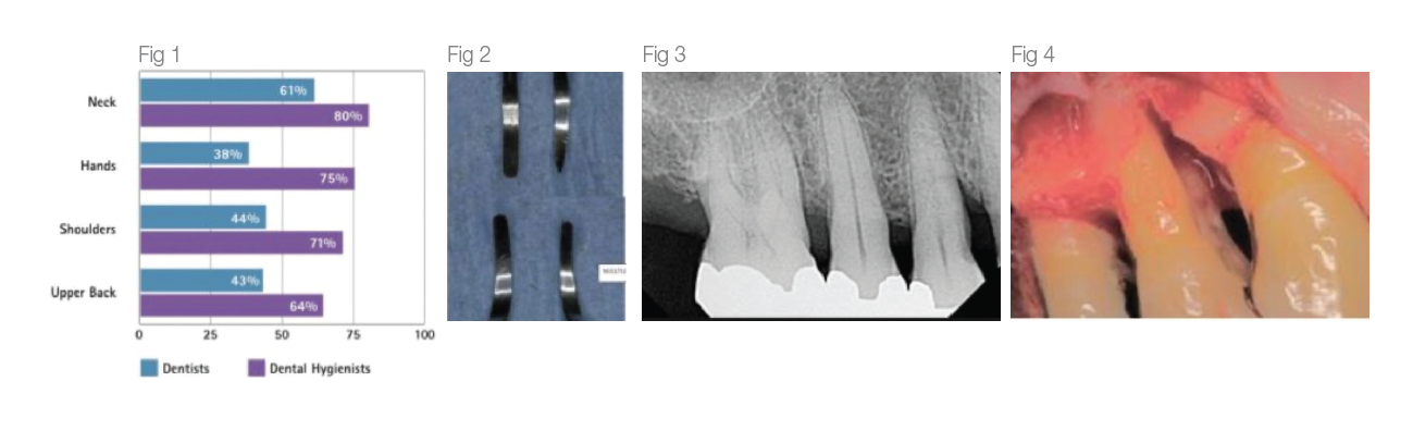 A literature review2 conducted by Johnson and Kanji in 2016 states that 92% of Dental Professionals reported symptoms in at least 1 anatomical, upper body region in the past 12 months with Dental Hygienists being the group most affected (see Fig 1). Work related Musculo- skeletal Disorders (MSD) in dental hygienists are often blamed on repetitive movements, awkward and static postures, pinch- grasp, forceful exertions, vibration, poor ergonomics, and insufficient breaks amongst other factors.