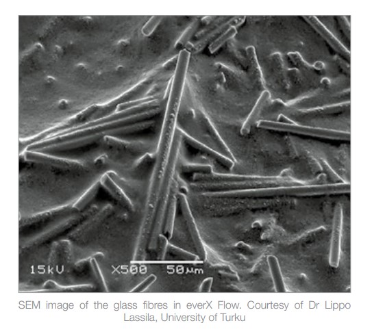 By structure, everX Flow contains both micro and macrofill particles. Fibres are big particles that make it slightly less polishable even though the wear resistance in vitro is very good. Based on the wear behaviour, it could be exposed in approximal contact points. However, the official instruction remains to cover everX Flow on the proximal surfaces with regular composite as well.