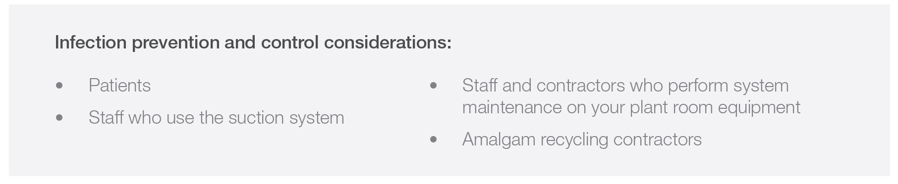 This may include anyone that may enter the plant room. Keep in mind that suction systems within the plant room will undergo weekly and annual routine maintenance as well as potential irregular maintenance, including the collection of amalgam retention containers for recycling purposes.