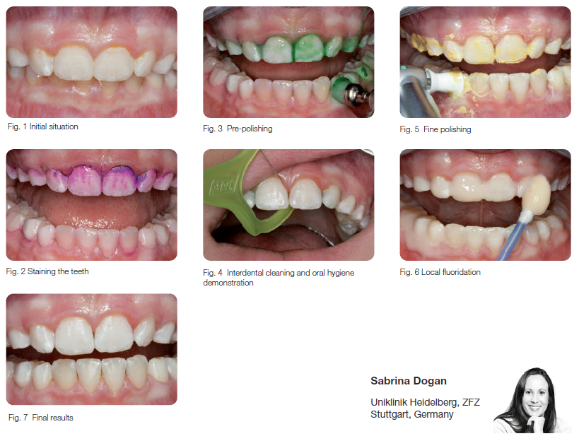 After an in-depth consultation with the patient‘s mother and inspecting the oral cavity, prophylaxis treatment commenced. In line with the patient‘s age, a PSI code of 0–1 was assessed and the plaque test evaluated with 41%. The maxillary and mandibular front teeth as well as the cervical dental surfaces were primarily affected by plaque. For oral hygiene at home, the patient uses an Oral-B power toothbrush (Triumph 5000) and sometimes a manual toothbrush in the morning. The patient uses adult toothpaste. To clean the interdental spaces, the patient uses dental floss. Due to the present structured plaque in the maxillary front teeth, visualized by Mira-2- Ton, and the extrinsic stains in the mandibular front teeth (Fig. 2), I performed pre-polishing.
