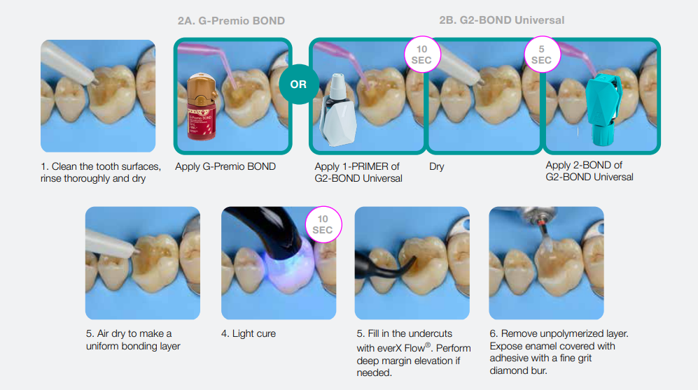 • When doing immediate dentine sealing with G-Premio BOND, it is recommended to add a thin layer of G-ænial™ Universal Injectable or a flowable composite on top.