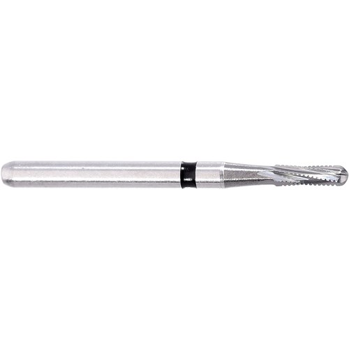 H36R cylinder with round end and cross cut, tungsten carbide cutter for cutting metal crowns. FG 314 shank, size 012 (1.2mm) diameter with 4.2mm working length. Apply crown remover at 45 degree angle.