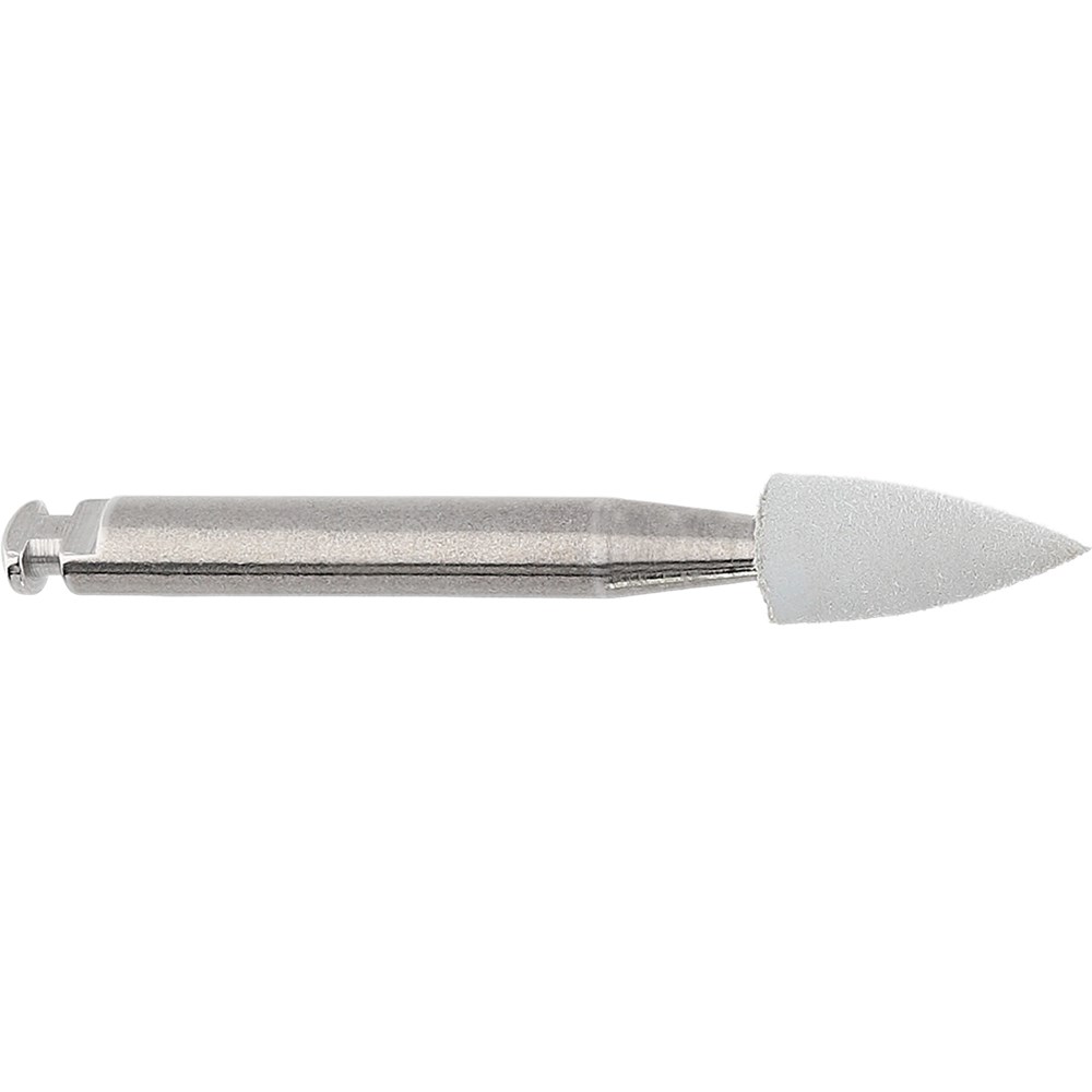 Composite polisher interspersed with diamond grit used with spray coolant. Flame, Fine, RA 204, with 030 diameter and 7mm working length.