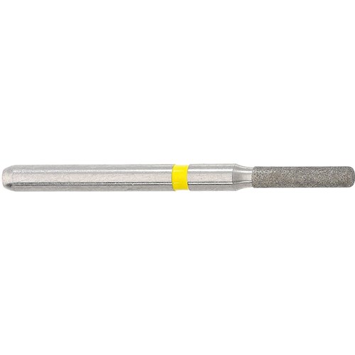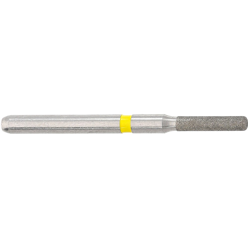 Short parallel shoulder with rounded edge, extra fine grit diamond, FG 314 shank size 018 with 6mm working length for finishing cavity prep, crown prep. Max recommended speed 450,000rpm