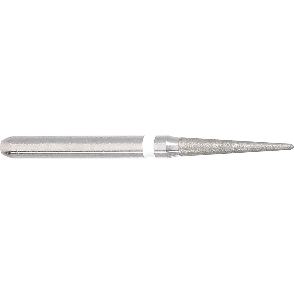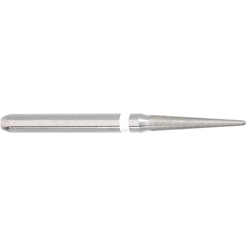 Pointed Ultra Fine grit, RA shank. Head diameter 014 (1.4mm) with 3.4 degree angle and working length of 8mm. Maximum recommended speed 300,000 rpm.