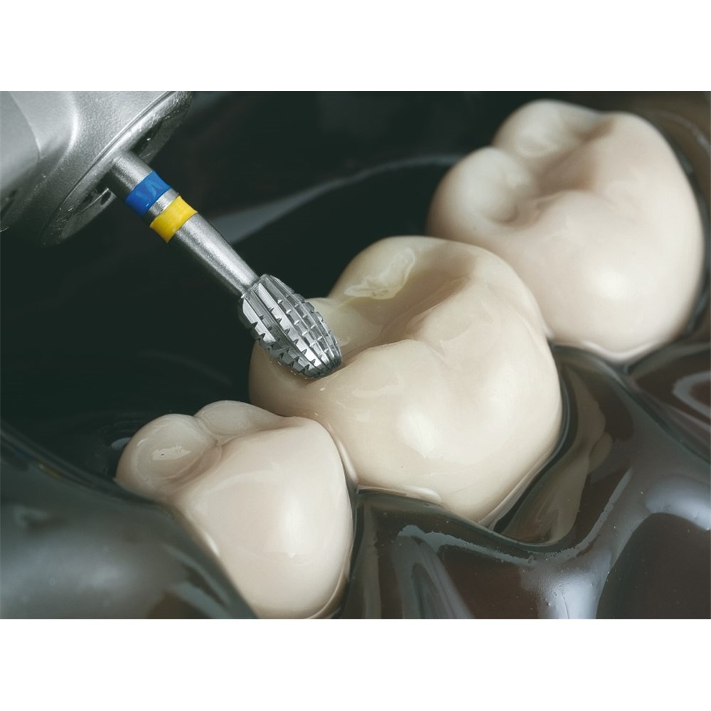 H379Q egg, Q-Finisher for working on palatal/occlusal surfaces of composites. FG 314 shank, size 023 (2.3mm diameter), with 4.2mm working length. Q-Finisher for efficient work on composites to achieve optimal results. Tungsten carbide finishers create smooth surfaces in little time and Q-Finishers provide a more efficient finishing procedure. A better surface quality can be achieved after just one finishing step, due to the cross cut toothing specially designed for work on fillings.