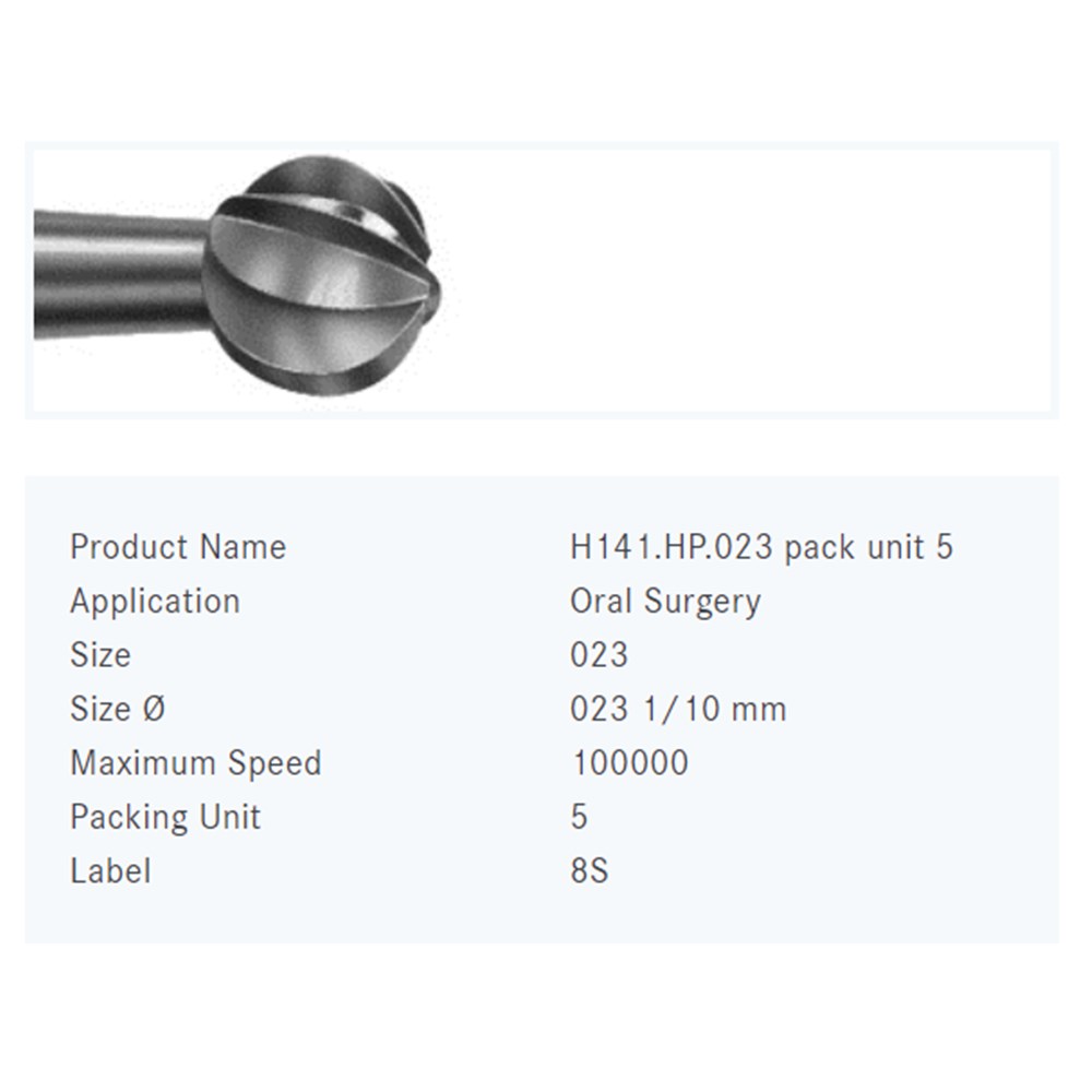 Oral Surgery tungsten carbide, round bone cutter H141A with special cutting design for smooth operation. RAXL 206 extra long shank for right-angle handpiece, size 023 (2.3mm) diameter. US number 8SA.