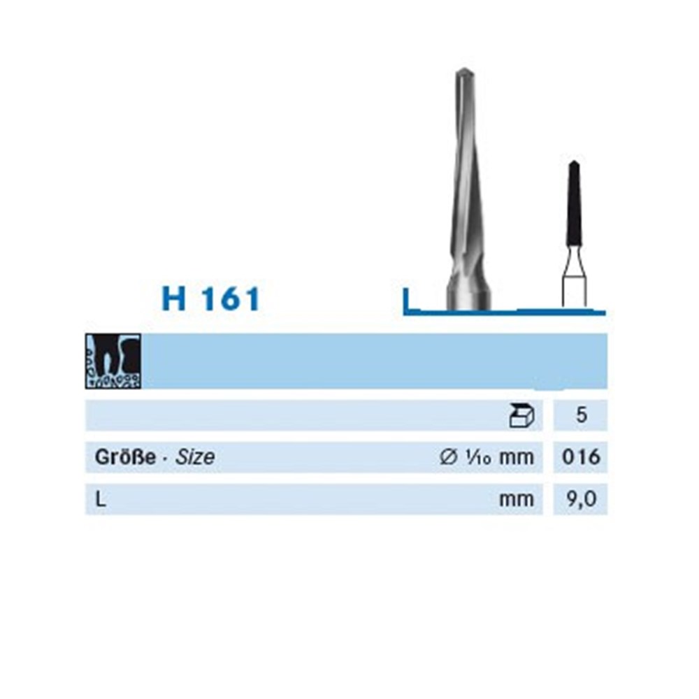 Oral Surgery tungsten carbide, Lindemann bone cutter H161. HP 104 shank for straight surgical handpiece, size 016 (1.6mm) diameter with 9mm working length.
