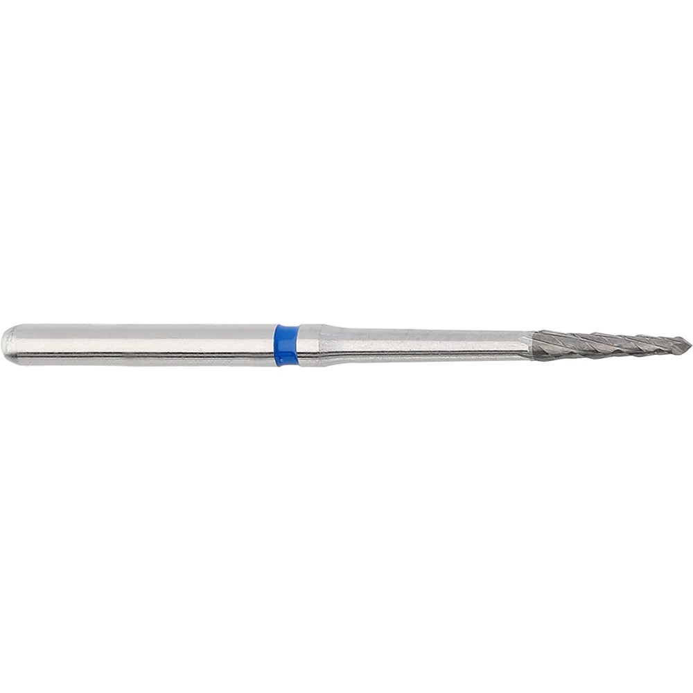 H254E tapered fissure, oral surgery tungsten carbide bone cutter. Combination instrument for conservative preparation of bone tissue and hard tooth substance. FG 314 shank, size 012 (1.2mm diameter) and 6mm working length. Total length 26mm.