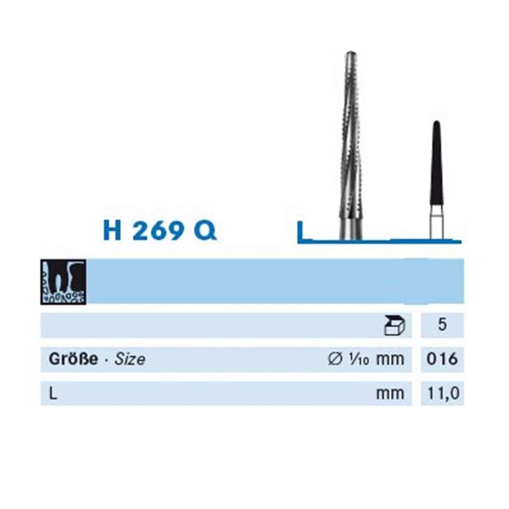 H269Q tapered, oral surgery tungsten carbide bone cutter. FG 314 shank, size 016 (1.6mm diameter) and 11mm working length.