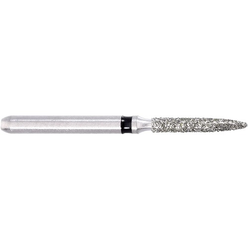 Flame, friction grip, super-coarse Grit (181um). Head Diameter size = 012 (1.2mm). With Feather Edge. Working Length of Diamond Grit Part = 8mm. Recommended Max. Speed = 300,000rpm. Matches H48L carbide finisher series.