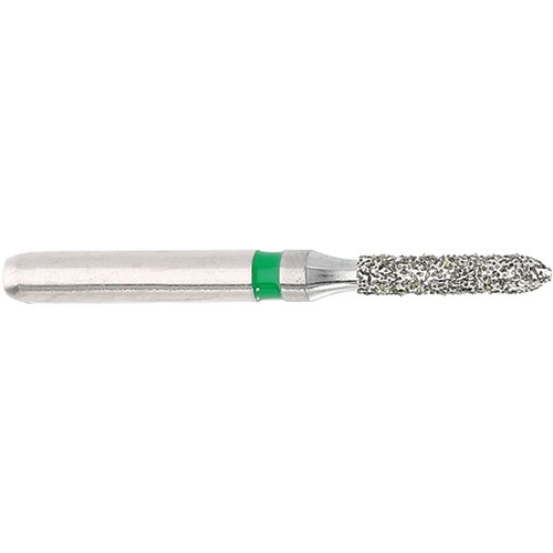 Short parallel chamfer, torpedo, course grit, friction grip short / paedo diamond. Head diameter 012 (1.2mm) with 6mm working length. Maximum recommended speed 160,000 rpm. Matches H282 carbide finisher series