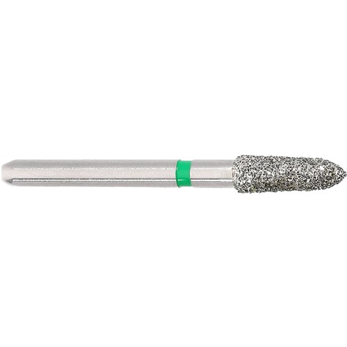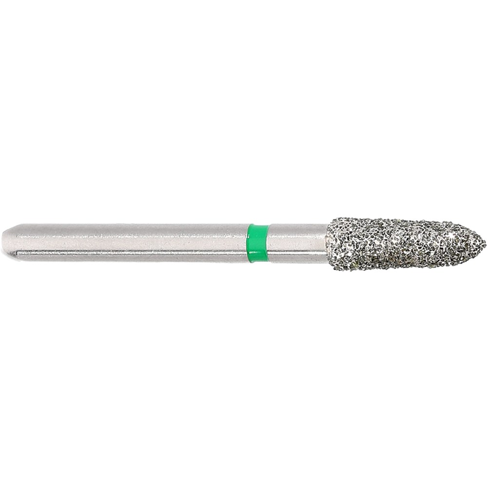 Short tapered chamfer, torpedo, course grit, friction grip diamond. Head diameter 021 (2.1mm) with 2 degree angle and 6mm working length. Maximum recommended speed 300,000 rpm. Matches H282K carbide finisher series