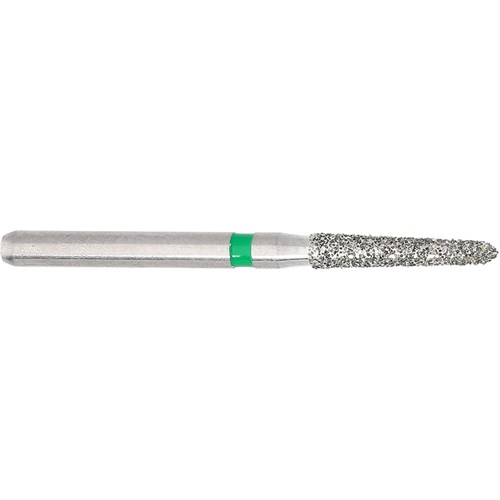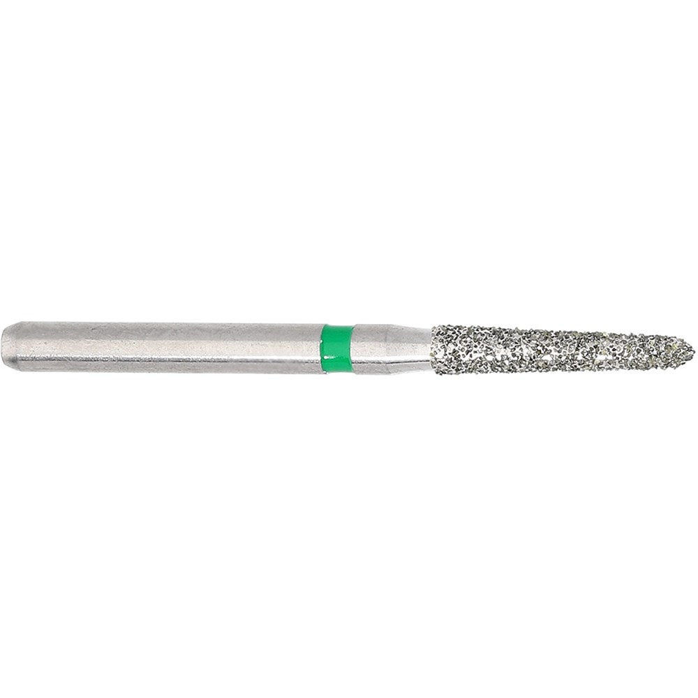 Tapered chamfer, torpedo course grit, friction grip diamond. Head diameter 016 (1.6mm) with 2 degree angle with 8mm working length. Maximum recommended speed 300,000 rpm. Matches H283K carbide finisher series.