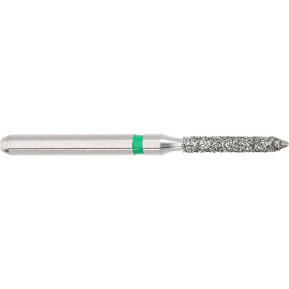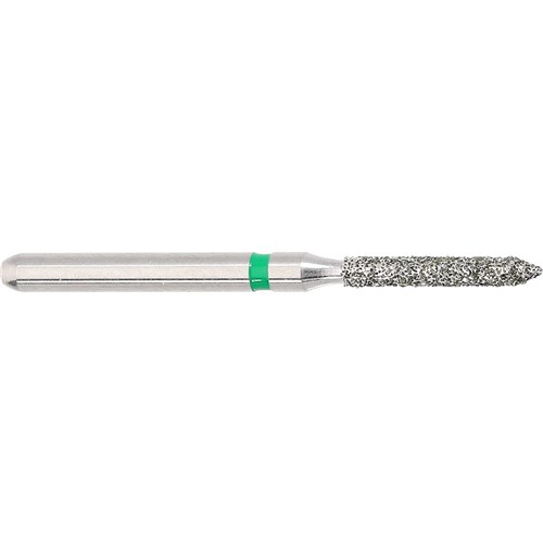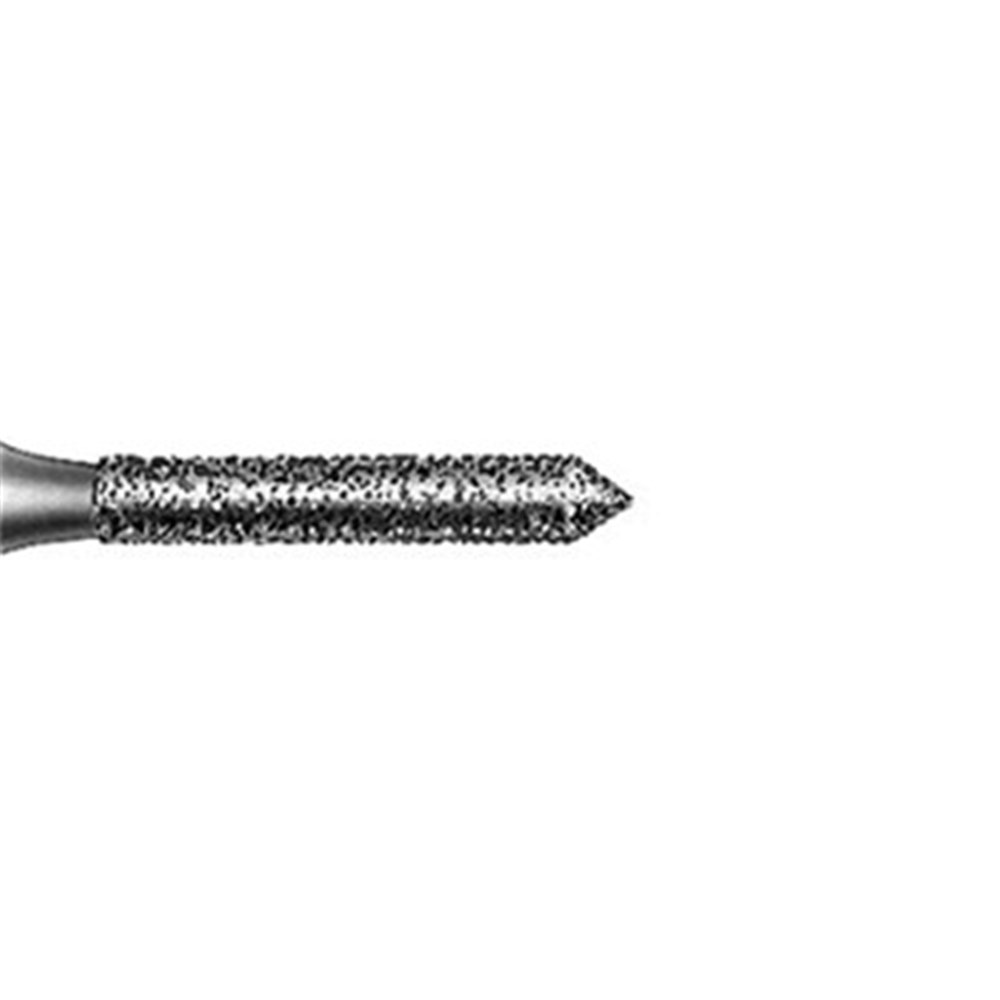 Cylinder with beveled tip, course grit, friction grip diamond. Head diameter 014 (1.4mm) and 8mm working length. Maximum recommended speed 300,000 rpm.