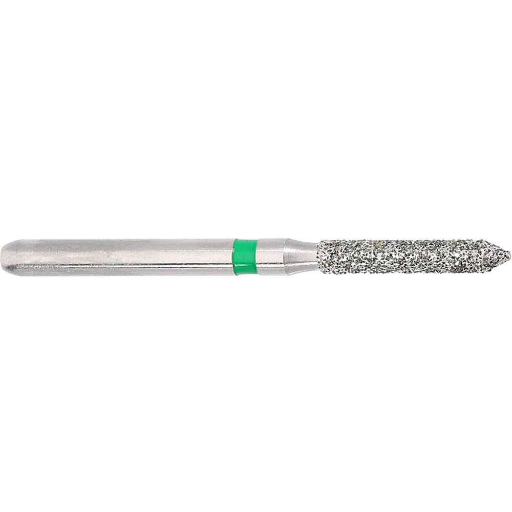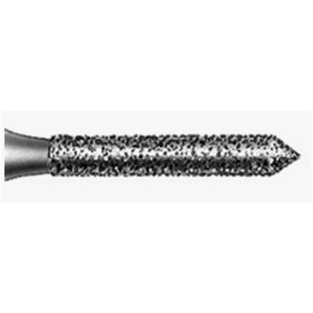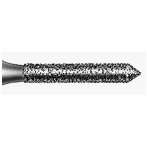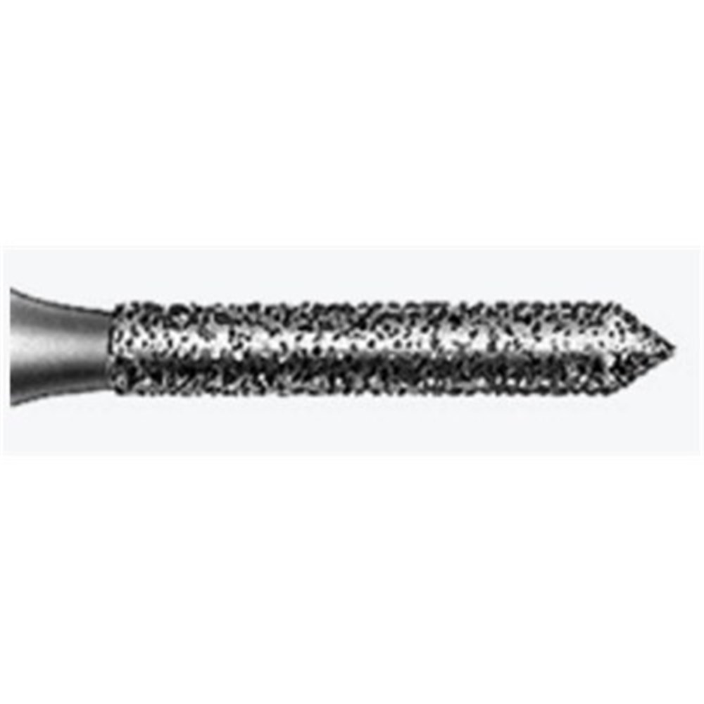 Cylinder with beveled tip, course grit, friction grip diamond. Head diameter 012 (1.2mm) and 8mm working length. Maximum recommended speed 300,000 rpm.