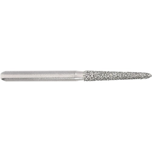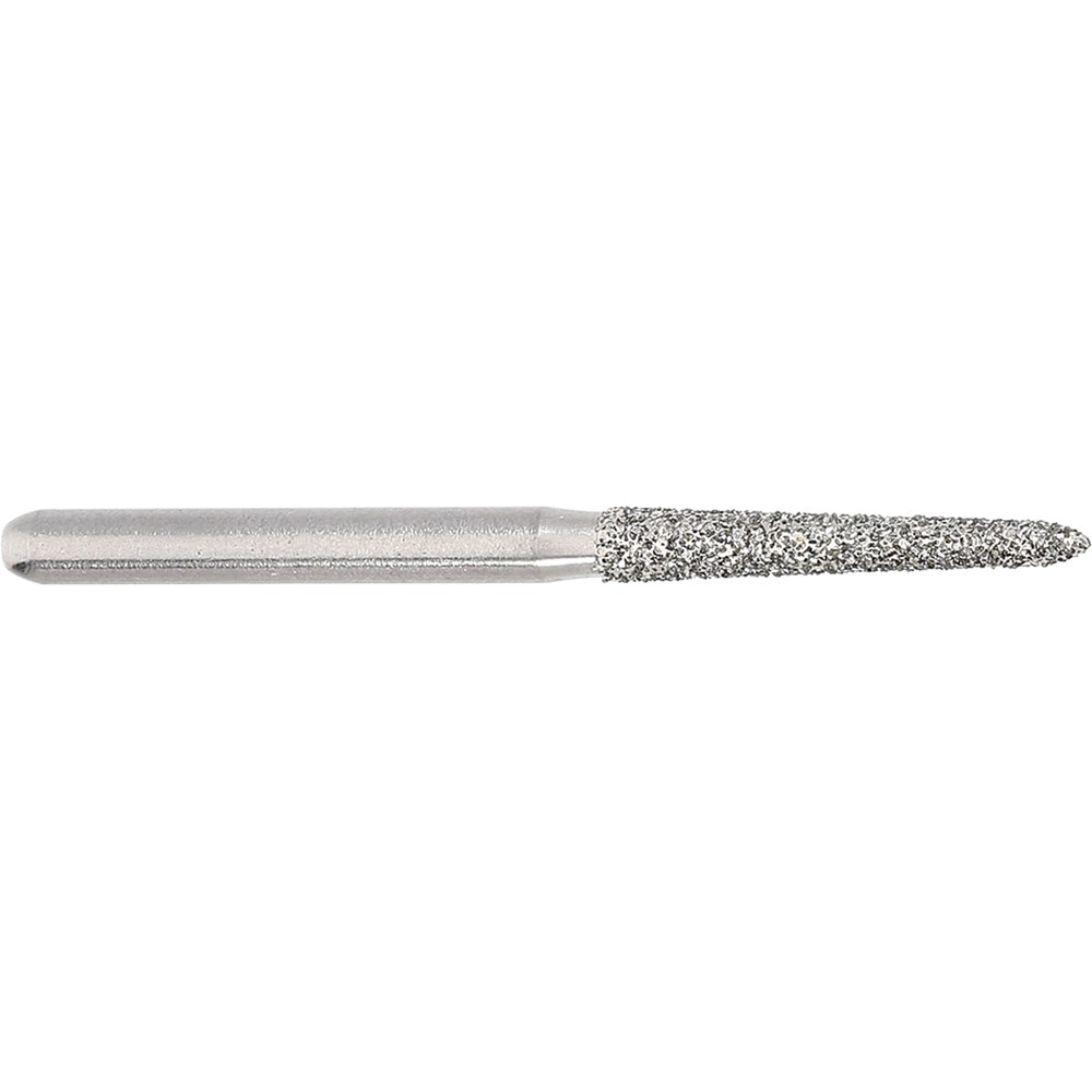 Long tapered chamfer, torpedo medium grit, friction grip diamond. Head diameter 016 (1.6mm) with 2 degree angle and 10mm working length. Matches H284K carbide finisher series.