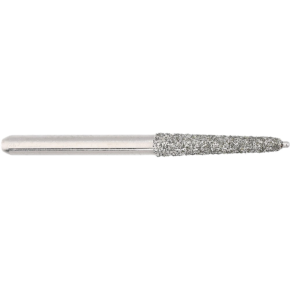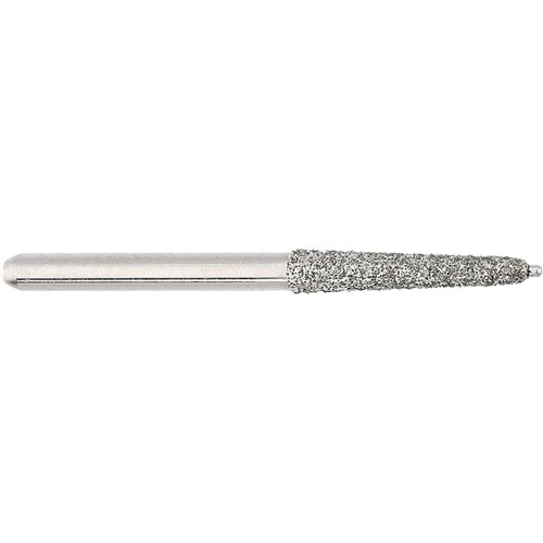 Long tapered chamfer torpedo for crown preparation with guide pin. Creates a cutting depth of 0.33mm at the crown margin. Medium grit, FG 314, 018 diameter, 10mm working length plus 0.5 pin. 2 degree taper.