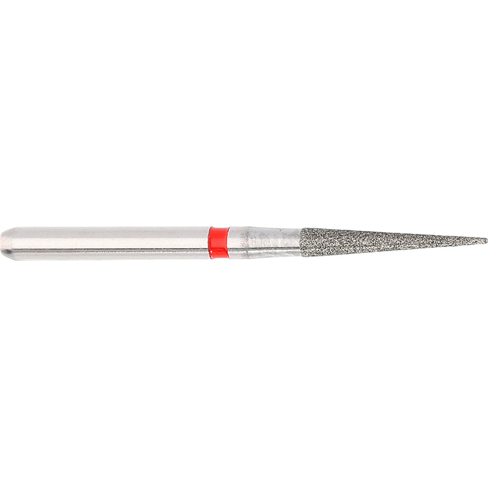 Tapered pointed finishing diamond for crown preparation of working on filling material. Fine grit, FG 314, 014 diameter, working length 9mm with a 3.7 degree taper. Matches H135/FS9 carbide finisher series.