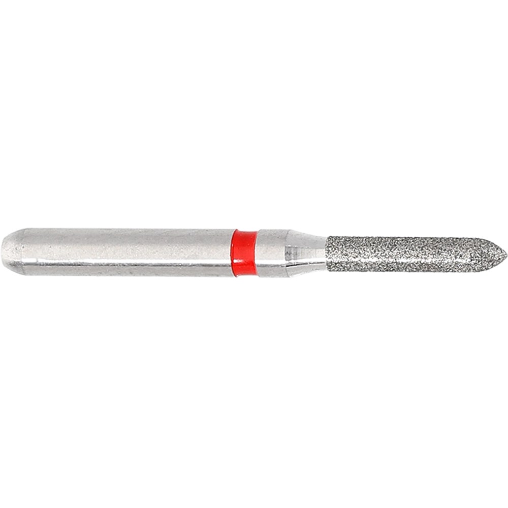 Short parallel chamfer, torpedo finisher for crown preparation or cavity preparation. Fine grit, friction grip short diamond. Head diameter 012 (1.2mm) with 6mm working length. Matches H282 carbide finisher series