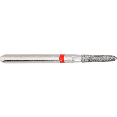 Short tapered chamfer, torpedo, fine grit, friction grip FG 314 diamond finisher for crown preparation or cavity preparation. Head diameter 014 (1.4mm) with 2 degree angle and 6mm working length. Matches H282K carbide finisher series