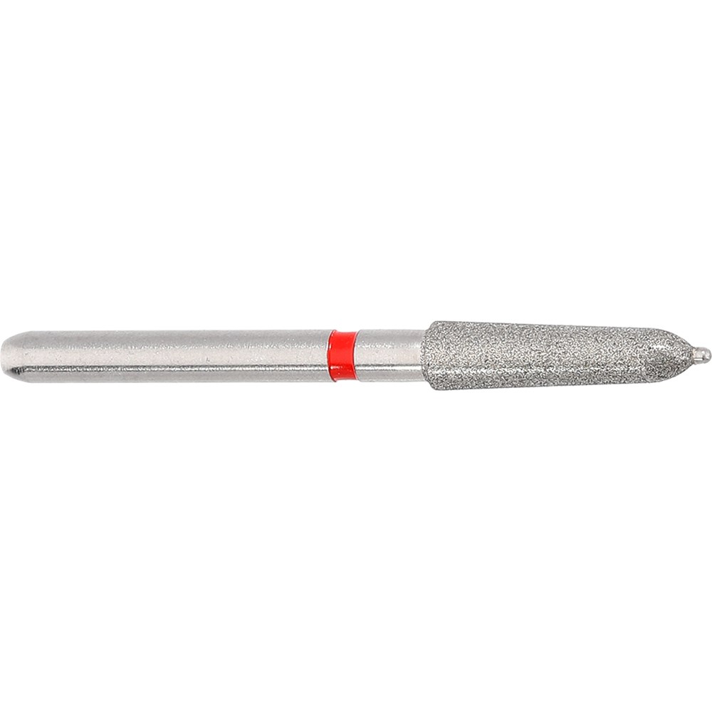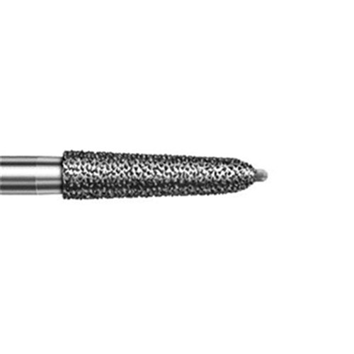 Tapered chamfer, torpedo finisher for crown preparations. Fine grit, FG 314, 021 diameter, working length 8mm plus 0.5mm tip and 2 degree taper. Creates a cutting depth of 0.54mm at the crown margin