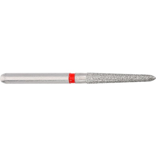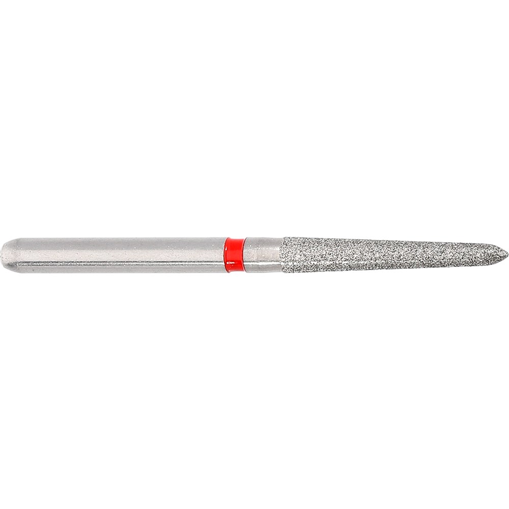 Long tapered chamfer, torpedo, fine grit, friction grip diamond. Head diameter 012 (1.2mm) with 2 degree angle and 10mm working length. Matches H284K carbide finisher series.