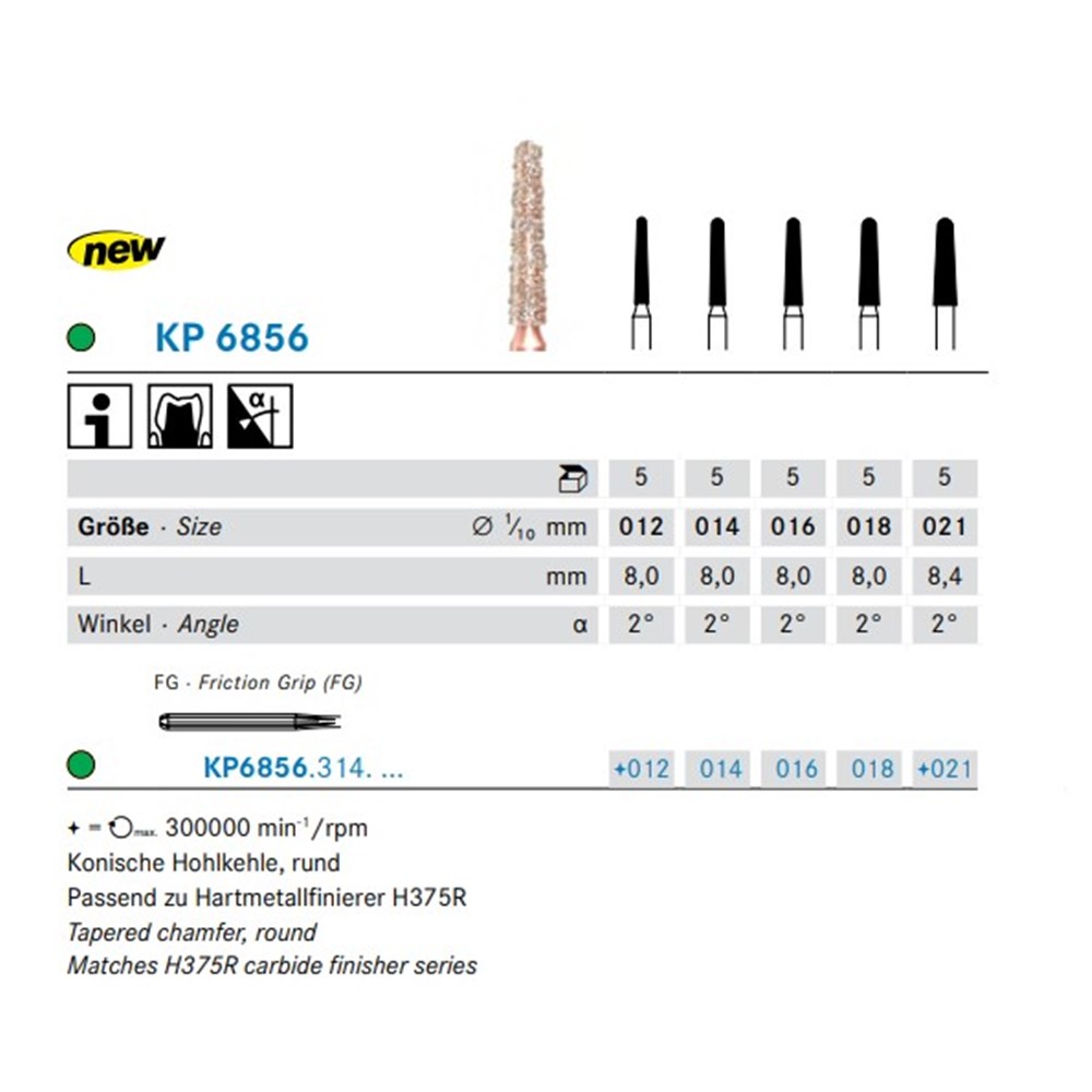 DIAO - KP6856 is a tapered chamfer round shaped coarse, firction grip diamond used for crown preparation. Size 016 (1.6mm) with length of 8.0mm, 2° angle.
