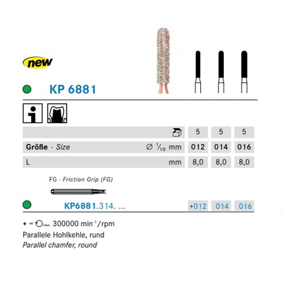 DIAO - KP6881 is a parallel chamfer rounded edge shaped coarse, friction grip diamond used for crown preparation. Head diameter 014 (1.4mm) with length 8.0mm.