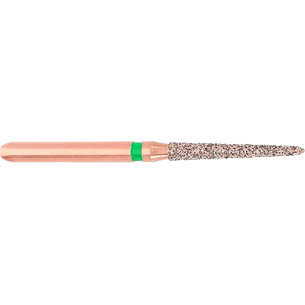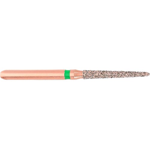 DIAO - KP6879k is a long tapered chamfer torpedo, friction grip diamond used for crown preparation. Size 014 (1.4mm) with length of 10.2mm, 2° angle.