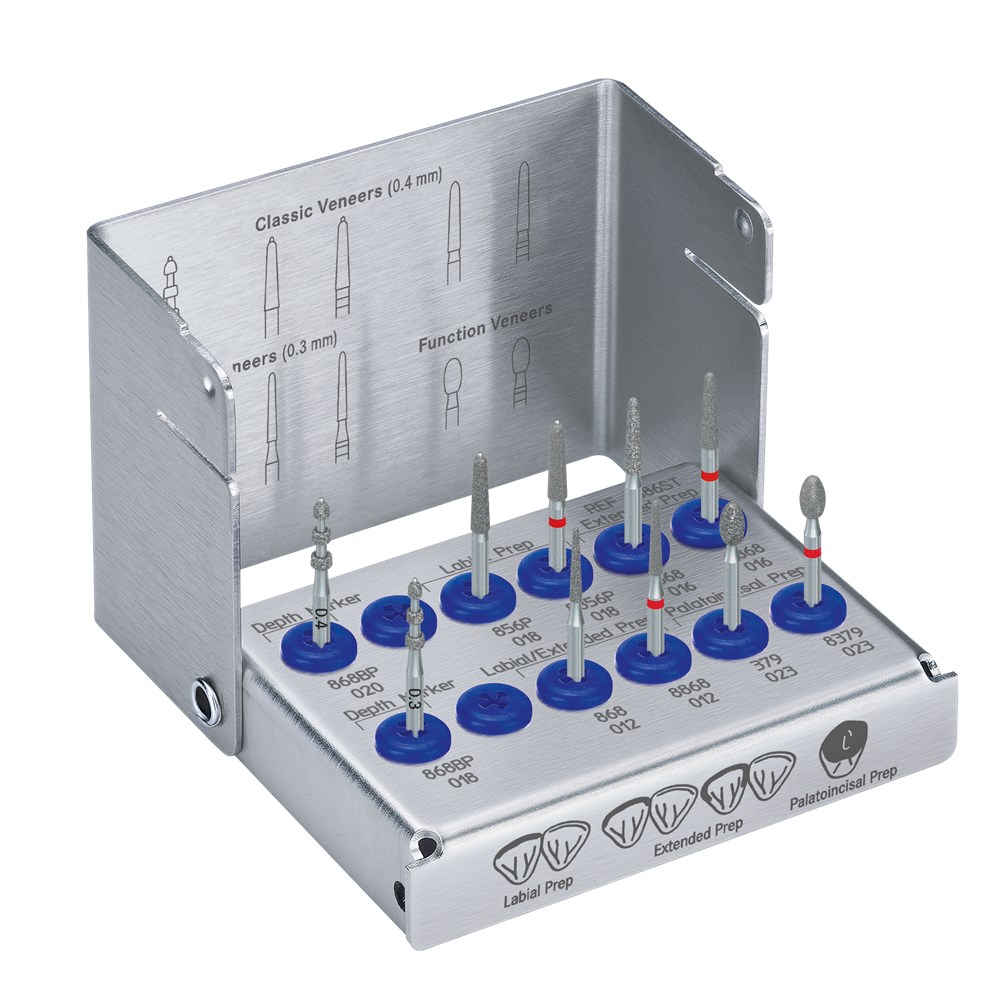 Perfect Veneer Preparations Set 4686ST in a steel autoclavable stand. Set 4686 consists of the following products: