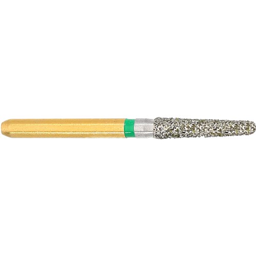 The S6856 is a tapered chamfer, round with a coarse (green) grit bur used for crown preparation.