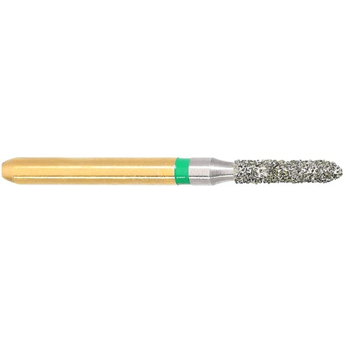 The S6877 is a short parallel chamfer, torpedo with a coarse (green) grit bur used for crown preparation.