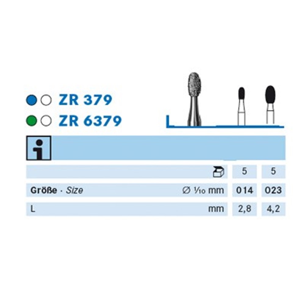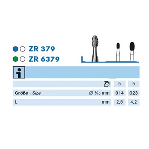 379 is medium grit diamond, football/egg shaped diamond bur used for occlusal adjustments in crown and bridge technique used in laboratory handpiece. HP 104 shank. Head Diameter size = 014 (1.4mm). Working Length of Diamond Grit Part = 2.8mm.