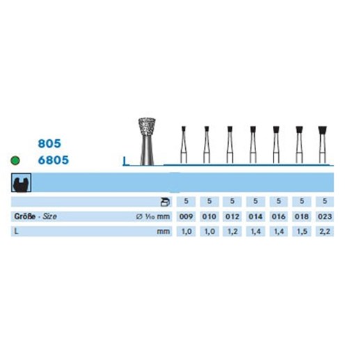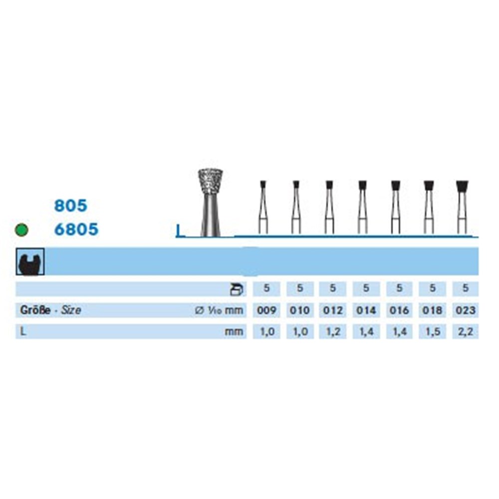 Medium grit inverted cone diamond handpiece 104 shank. Head diameter 014 (1.4mm) with working length 1.4mm. Maximum recommended speed 100,000 rpm.