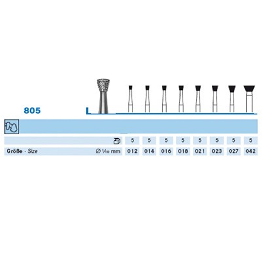 Medium grit inverted cone diamond handpiece 104 shank. Head diameter 018 (1.8mm) with working length 1.4mm. Maximum recommended speed 100,000 rpm.