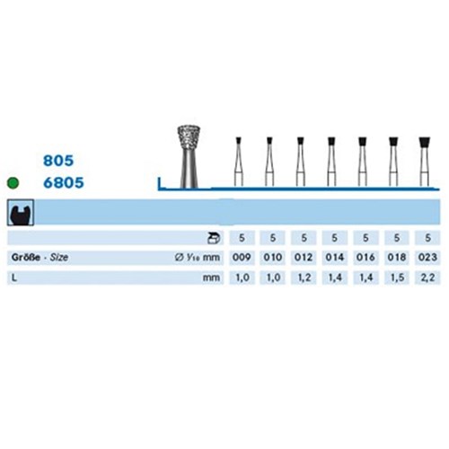 Medium grit inverted cone diamond handpiece 104 shank. Head diameter 023 (2.3mm) with working length 1.4mm. Maximum recommended speed 100,000 rpm.