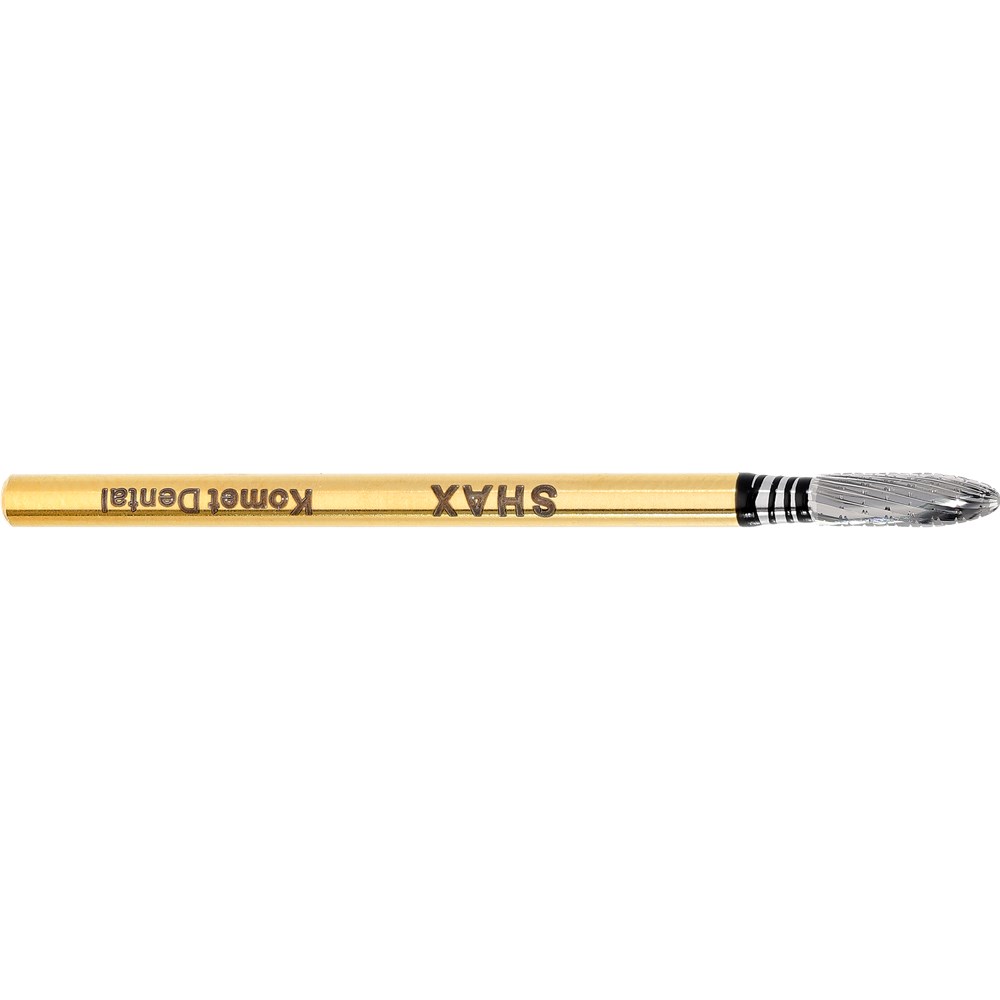 Shax are new generation of tungsten carbide cutters, for work on non-precious metals and model cast alloys. The active part is provided with a unique blade geometry where each tooth has its own individual height and depth. These cutters remove large amounts of material while creating a perfectly smooth finish on metal surfaces. H139SHAX, HP 104 shank for straight lab handpiece, size 023 (2.3mm) diameter with 8mm working length. For non-precious metal and model cast alloys.