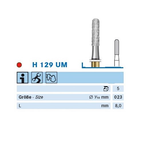 Laboratory tungsten carbide cutter H129UK, HP 104 shankfor straight lab handpiece, size 023 (2.3mm) diameter with 8mm working length. For non-precious metal, precious metal and model cast alloys.