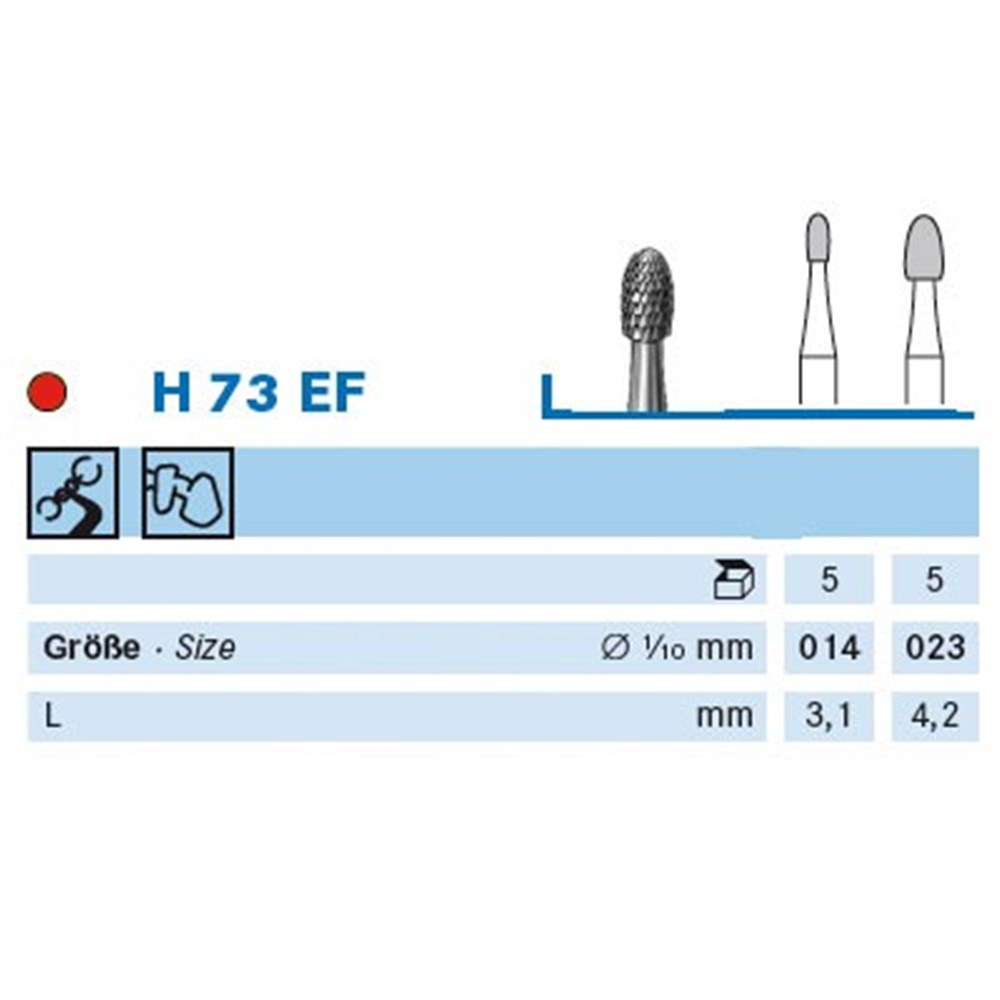 H73EF fine bud, tungsten carbide. HP 104 shank for laboratory handpiece Size 014 (1.4mm) diameter with 3.1mm working length. For acrylics and metal alloys.