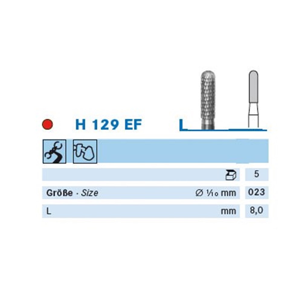 Laboratory tungsten carbide cutter H129EF, HP 104 shankfor straight lab handpiece, size 023 (2.3mm) diameter with 8mm working length. For acrylics and metal alloys
