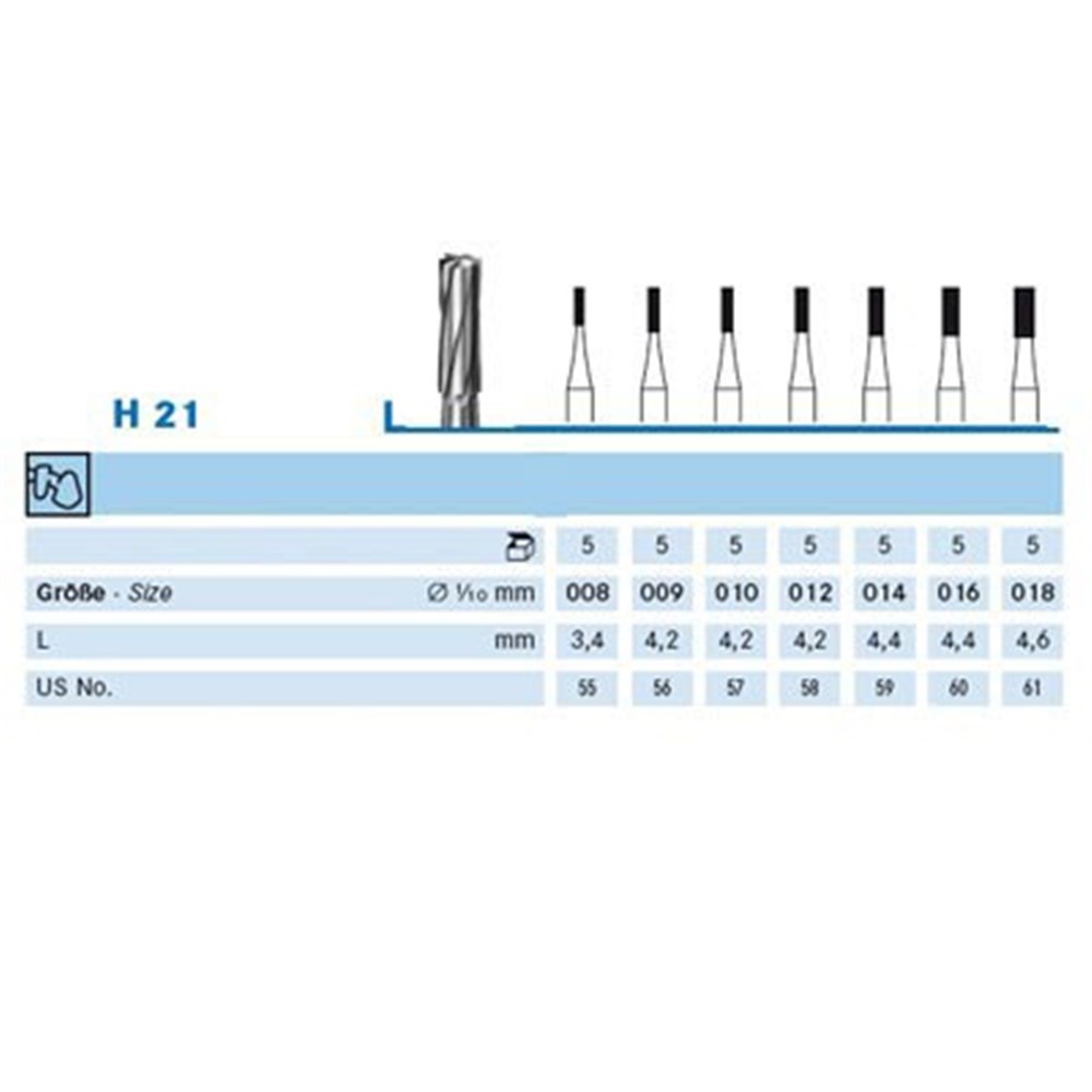 Laboratory tungsten carbide cutter H21 cylinder, HP 104 shank for straight lab handpiece, size 008 (0.8mm) diameter with 3.4mm working length. US number 55