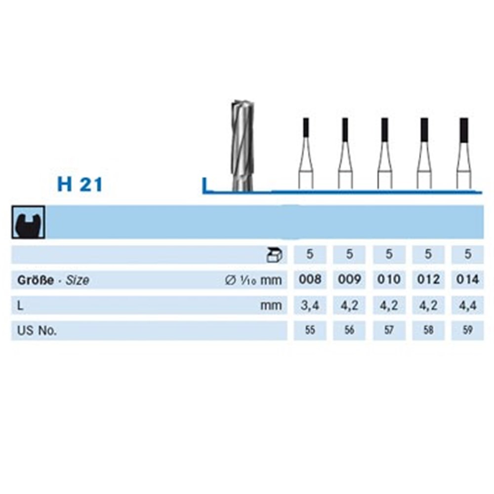 Laboratory tungsten carbide cutter H21 cylinder, HP 104 shank for straight lab handpiece, size 014 (1.4mm) diameter with 4.4mm working length. US number 59
