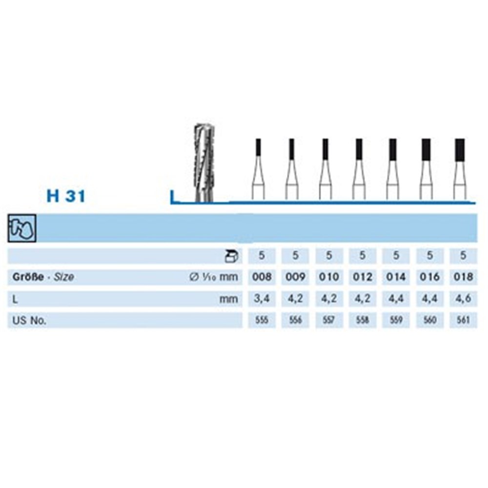 Laboratory H31 cylinder with cross cut, tungsten carbide cutter. HP 104 shank for straight lab handpiece, size 018 (1.8mm) diameter with 4.6mm working length. US number 561