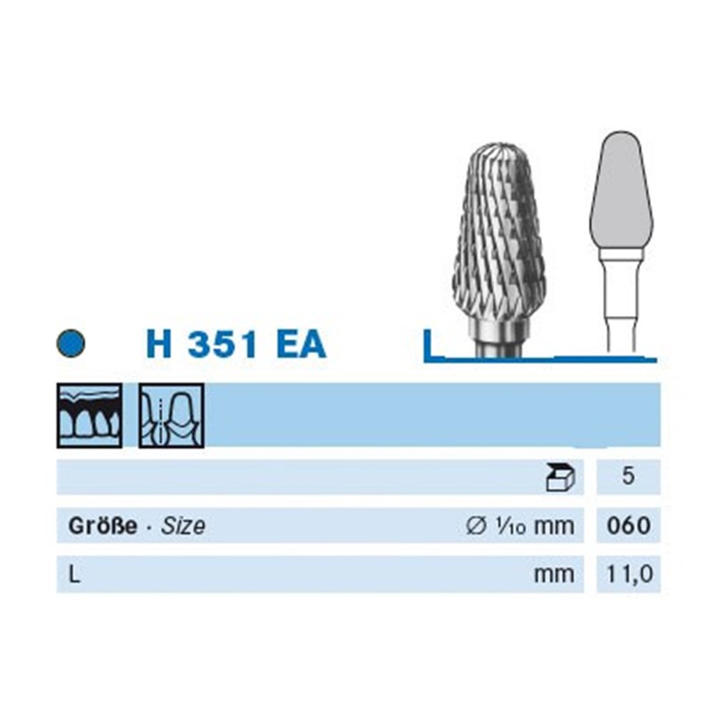 H351EA tungsten carbide laboratory cutter, safety toothing with a twist to the left for work on plaster and acrylics. HP 104 shank for laboratory handpiece, Size 060 (6mm) diameter, with 11mm working length.