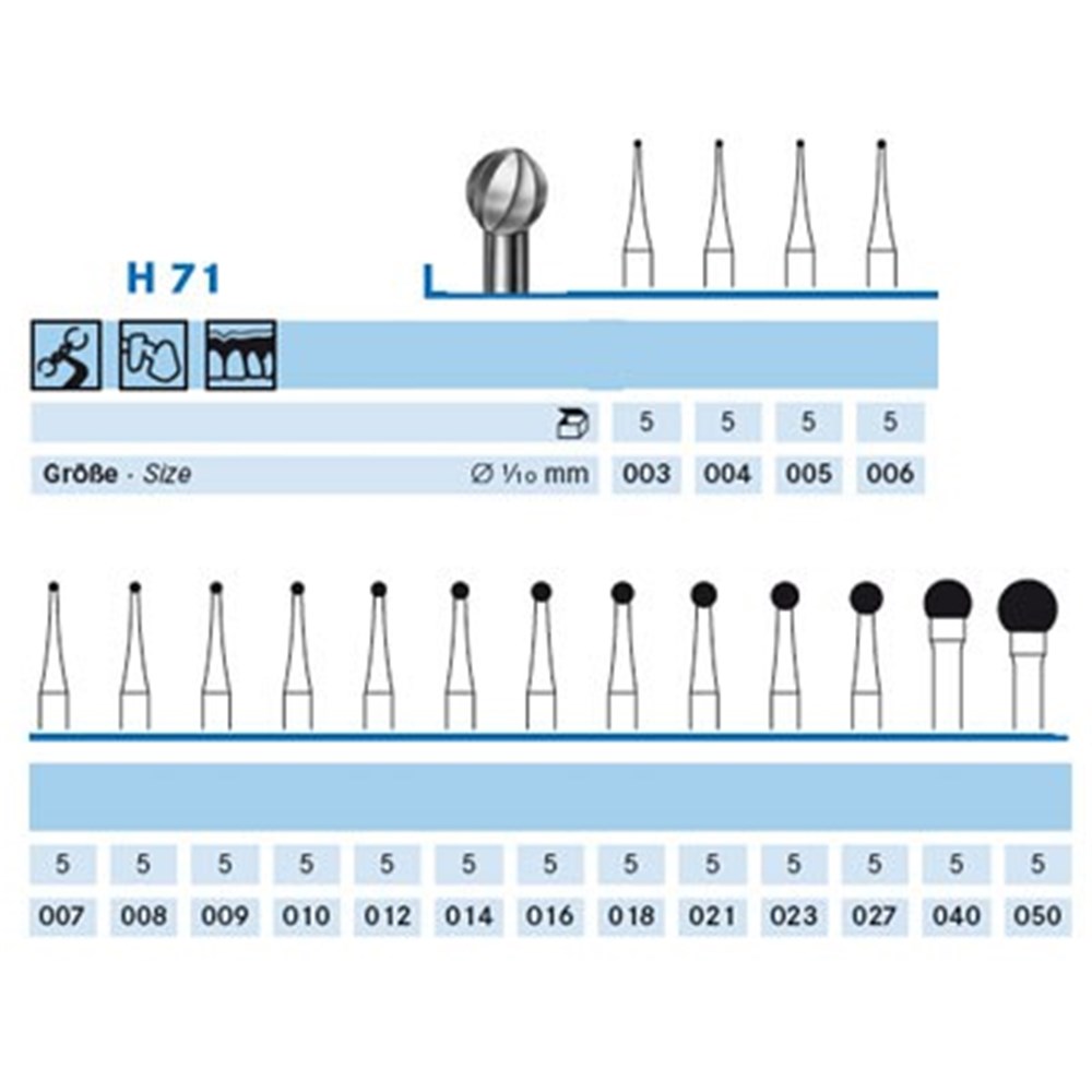 H71 round, tungsten carbide laboratory bur with lower solder joint: Tungsten carbide extends down shank for increased neck strength. HP 104 shank for laboratory or surgical handpiece Size 012 (1.2mm) diameter.